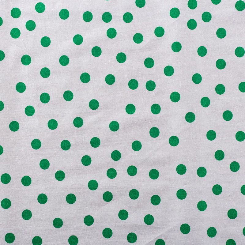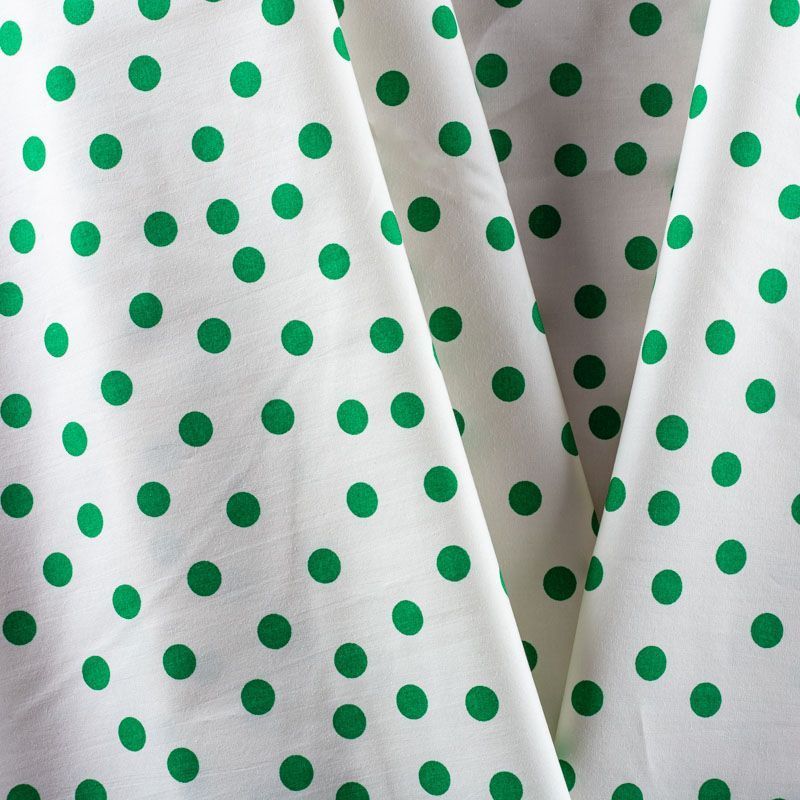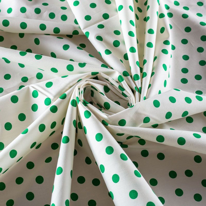 Молочный плательно-рубашечный хлопок с принтом в горошек средней величины зеленого цвета. Ткань имеет плотное переплетение, матовую гладкую поверхность, хорошо держит форму, не прозрачная. Подойдет для пошива рубашек, платья-рубашки, юбки, сарафана, туники, домашней одежды.