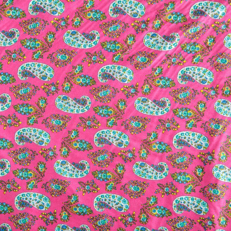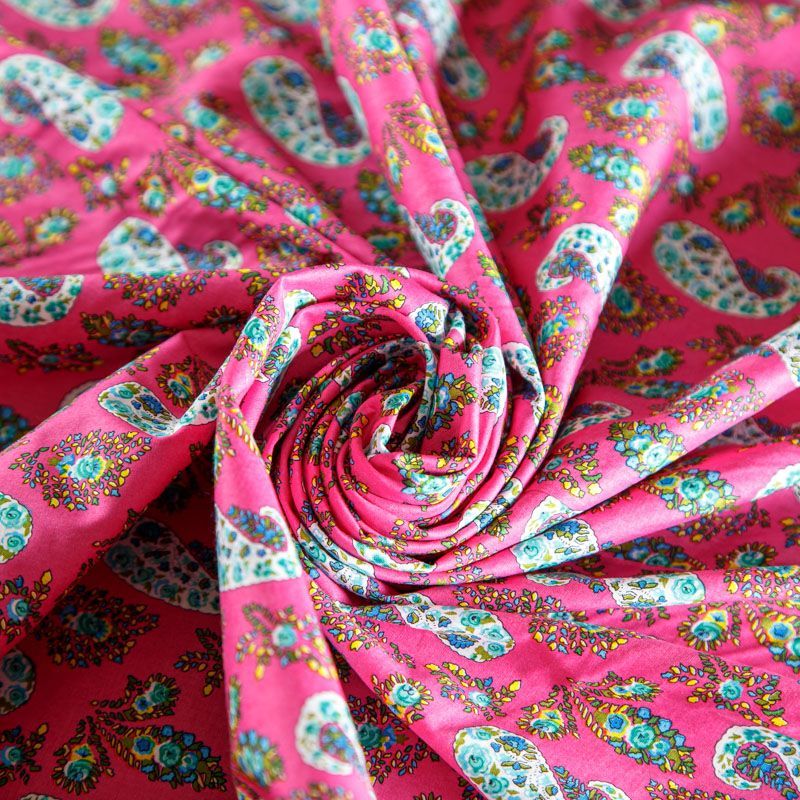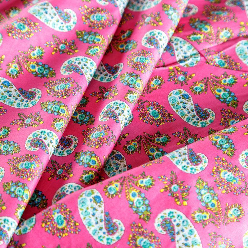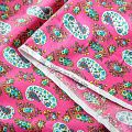 Плательно-рубашечная ткань из натурального хлопка с узором пейсли. Ткань легкая, тонкая, хорошо "дышит", слегка держит форму, не сухая, не прозрачная. Подойдет для пошива летнего платья, летящей юбки, блузы, сарафана, комбинезона или рубашки, а также для домашней одежды.