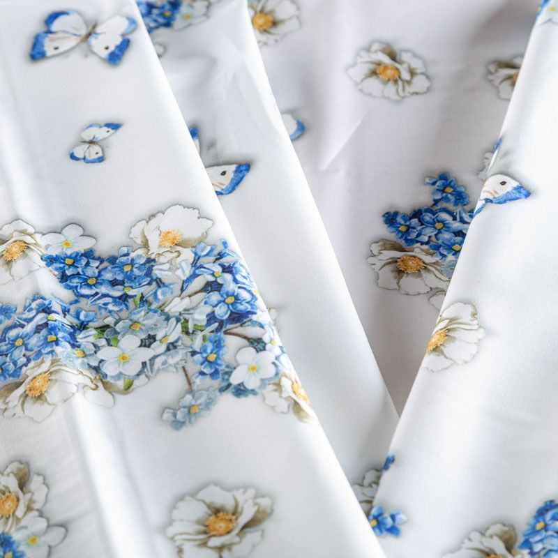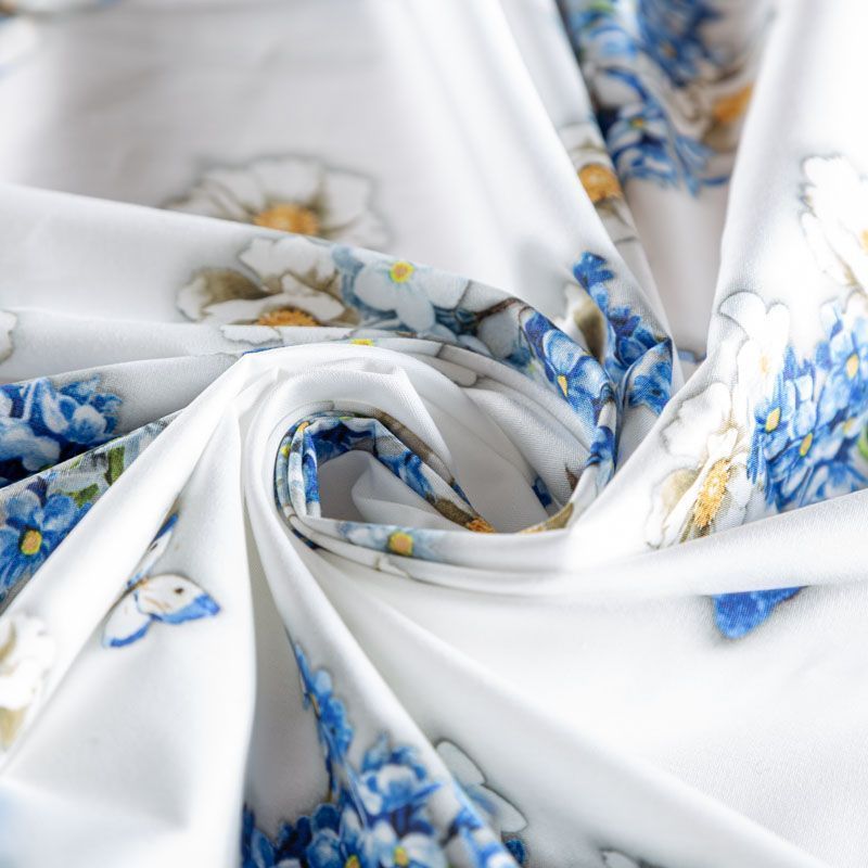 Плательно-рубашечный хлопок от бренда Monnalisa с цветочным летним принтом в сине-голубых оттенках. Ткань пластичная, легкая, немного просвечивает, поверхность гладкая, приятная на ощупь. Подойдет для пошива платья, рубашек, платья-рубашки, юбки, сарафана, туники, комбинезона, домашней одежды.