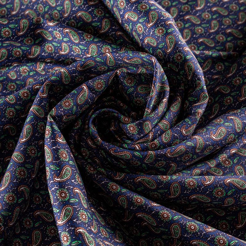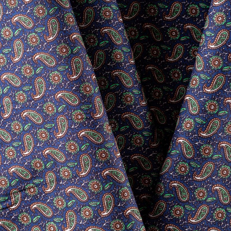 Рубашечно-плательный натуральный хлопок с узором пейсли в зеленых и терракотовых тонах на насыщенном чернильном фоне. Ткань имеет плотное переплетение, матовую гладкую поверхность, хорошо держит форму, не прозрачная. Подойдет для пошива мужских рубашек, платья-рубашки, юбки, сарафана, туники.