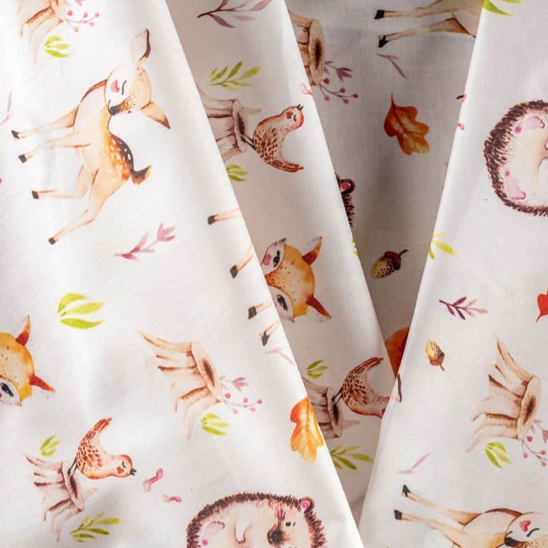 Итальянский натуральный хлопок с детским рисунком в виде лесных милых зверушек. Ткань легкая, тонкая, хорошо "дышит", мягкая, слегка прозрачная, по плотности напоминает батист. Подойдет для пошива домашней одежды, детских летних платьев, песочников, юбки, сарафана или рубашки, а также для для пошива постельных принадлежностей, подушек, покрывал, скрапбукинга, корзин и других видов творчества.