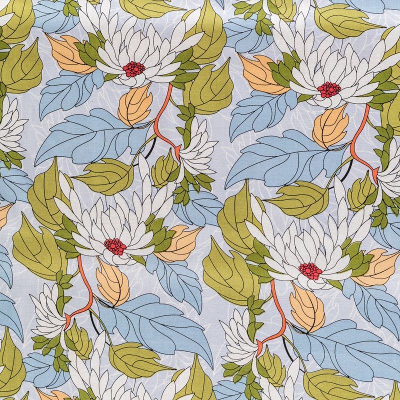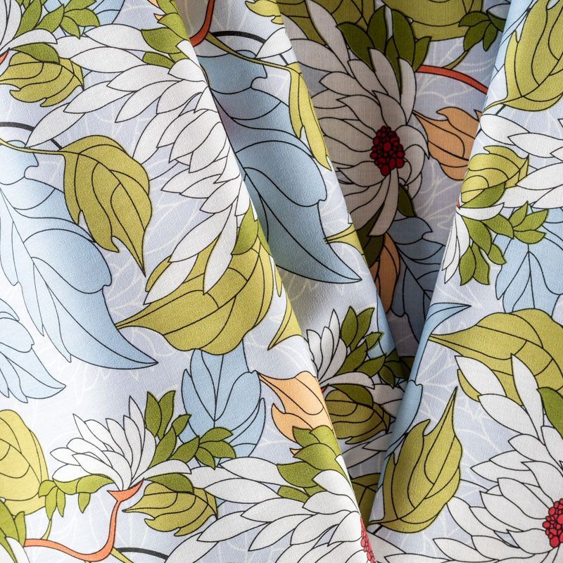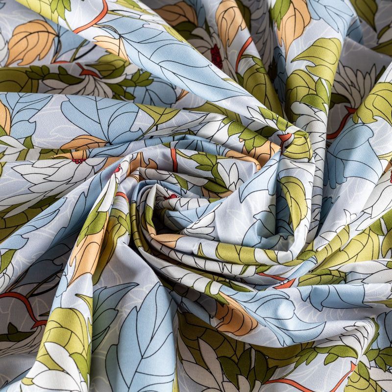 Плательно-рубашечный хлопок нежного голубого оттенка с крупным цветочным принтом в пастельных тонах. Полотно легкое, средней плотности, очень нежное и пластичное, тянется, не держит форму. Материал отлично драпируется, формируя мягкие складки. Подойдет для прямых, полуприлегающих, расклешенных моделей платьев, сарафанов, а также юбки, туники, платье-рубашки.