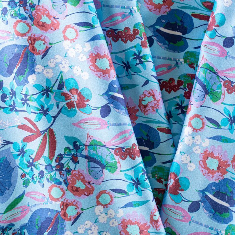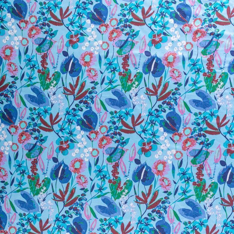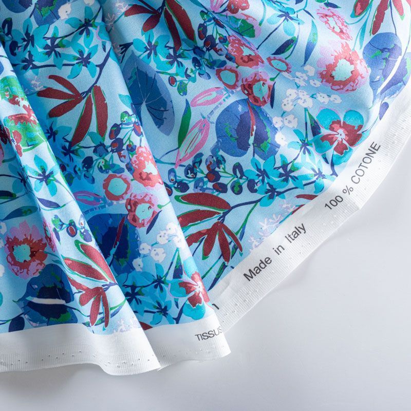 Плательно-рубашечный натуральный хлопок от французского дизайнера с акварельным растительным принтом на голубом фоне. Ткань имеет плотное переплетение, матовую гладкую поверхность, хорошо держит форму, не прозрачная. Подойдет для пошива рубашек, платья-рубашки, юбки, сарафана, туники, домашней одежды.