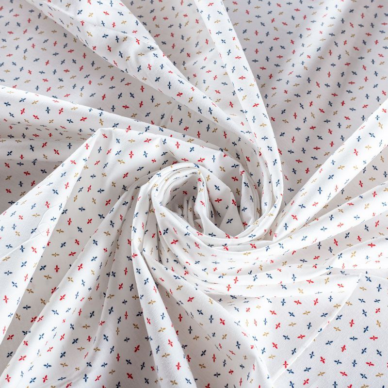Плательно-рубашечный хлопок в разноцветный мелкий геометрический рисунок. Ткань мягкая, лёгкая, непрозрачная, пластичная и приятная к телу, хорошо драпируется, имеет гладкую матовую поверхность и сатиновое плетение. Прекрасно подойдет как для пошива платья-рубашки, сарафана, платьев различных фасонов, туники, топа, летнего костюма, комбинезона, мужской и детской одежды.