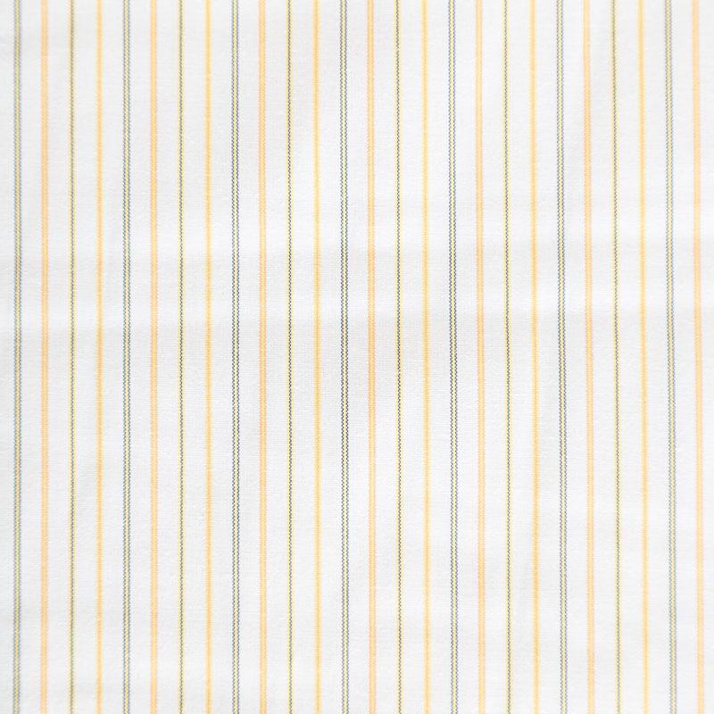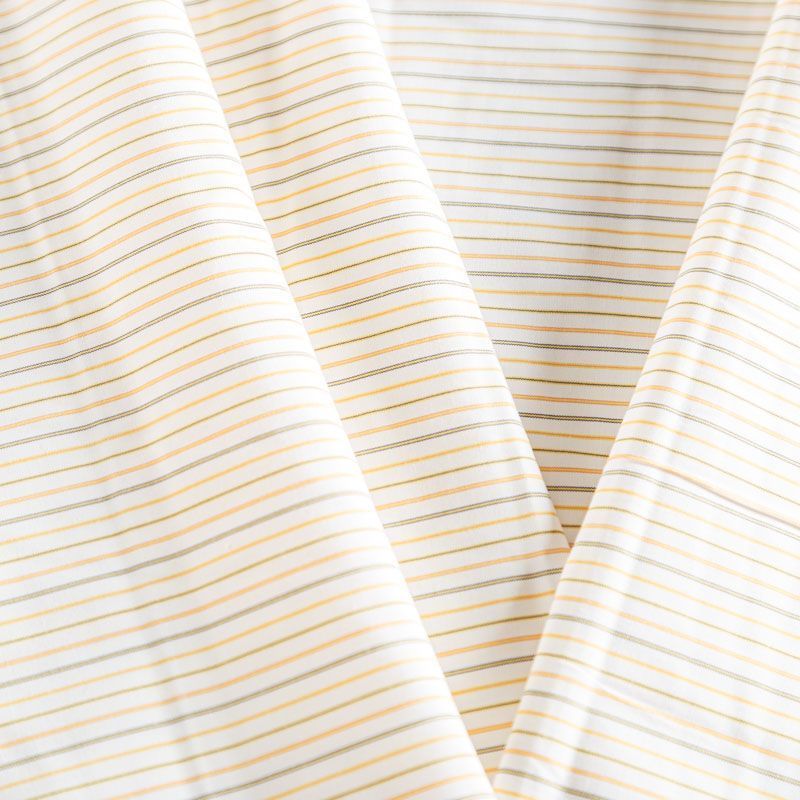 Плательно-рубашечный хлопок в белого цвета в желто-серую полоску. Ткань мягкая, лёгкая, непрозрачная, пластичная и приятная к телу, хорошо драпируется, имеет гладкую матовую поверхность и сатиновое плетение. Прекрасно подойдет как для пошива платья-рубашки, сарафана, платьев различных фасонов, туники, топа, летнего костюма, комбинезона, мужкой и детской одежды.