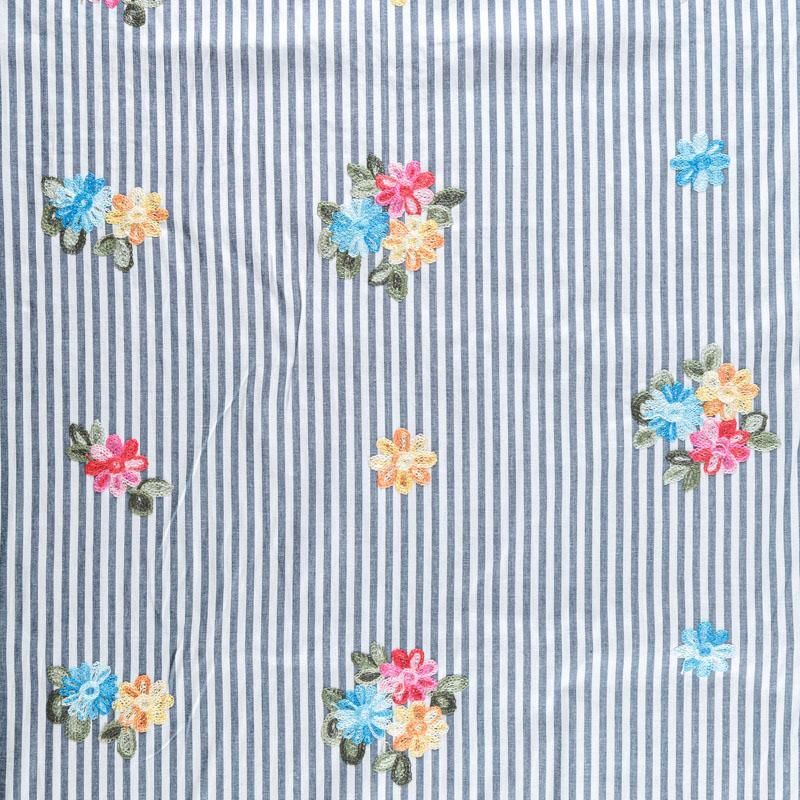 Плательно-блузочный хлопок белого цвета в серо-голубую полоску декорирован яркой цветочной вышивкой. Полотно средней плотности, слегка просвечивает, очень нежное и пластичное, держит форму. Материал отлично драпируется, формируя мягкие складки. Подойдет для прямых, полуприлегающих, расклешенных моделей платьев, сарафанов, а также юбки, туники, платье-рубашки.