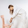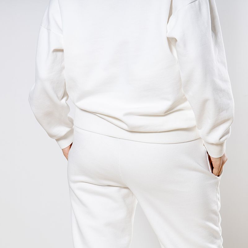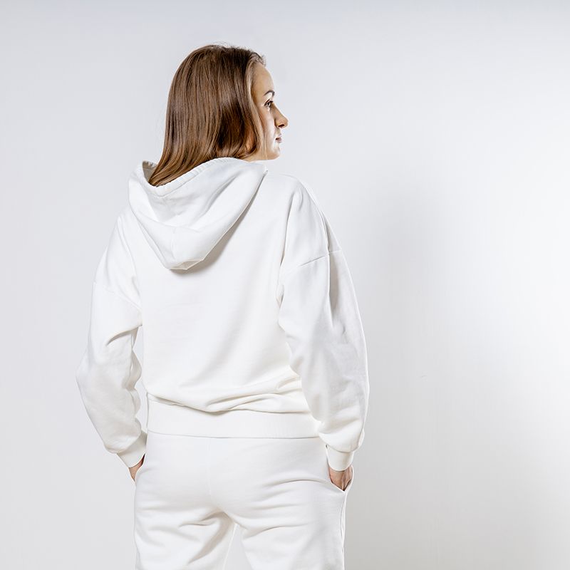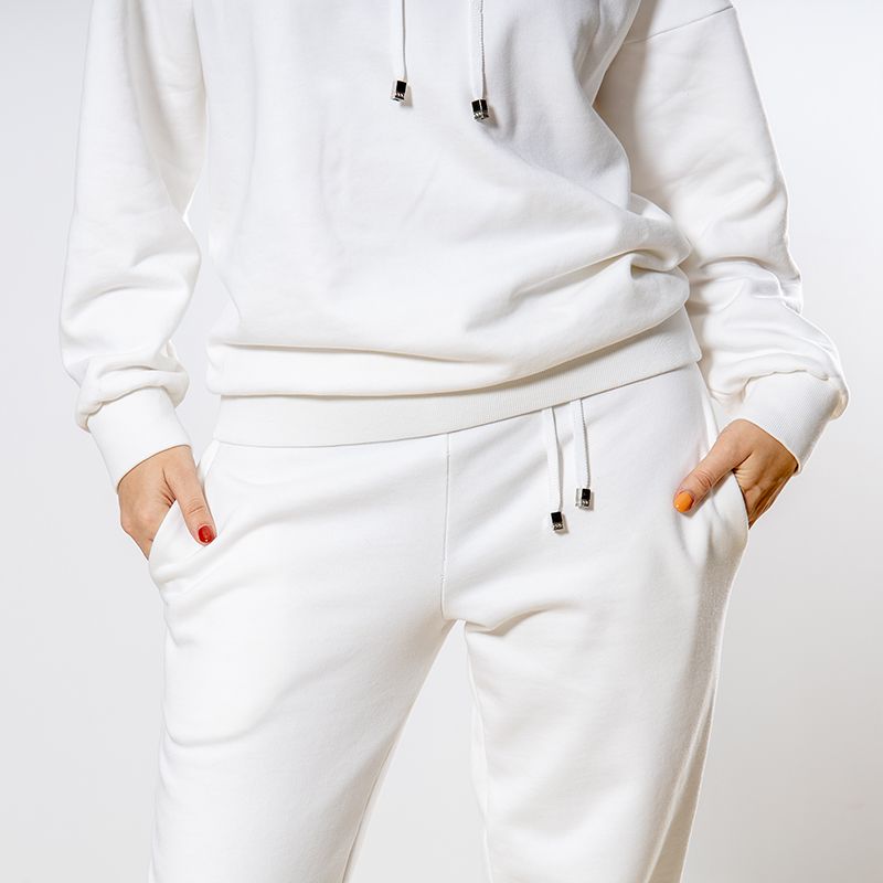 Женский костюм из 3-х ниточного футера с начесом белоснежного цвета. Комплект состоит из худи и штанов. Худи с капюшоном, который фиксируется на шнурок с металлическими наконечниками. Рукава спущенные. Манжеты на рукавах, штанах и низ худи выполнены из хлопкового кашкорсе в цвет костюма. Штаны свободной посадки, в поясе - резинка и дополнительная фиксация на шнурок под завязку. Карманы расположены в боковых швах. Костюм предназначен для прогулок, активного отдыха и занятий спортом.