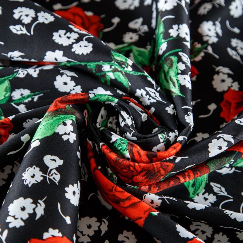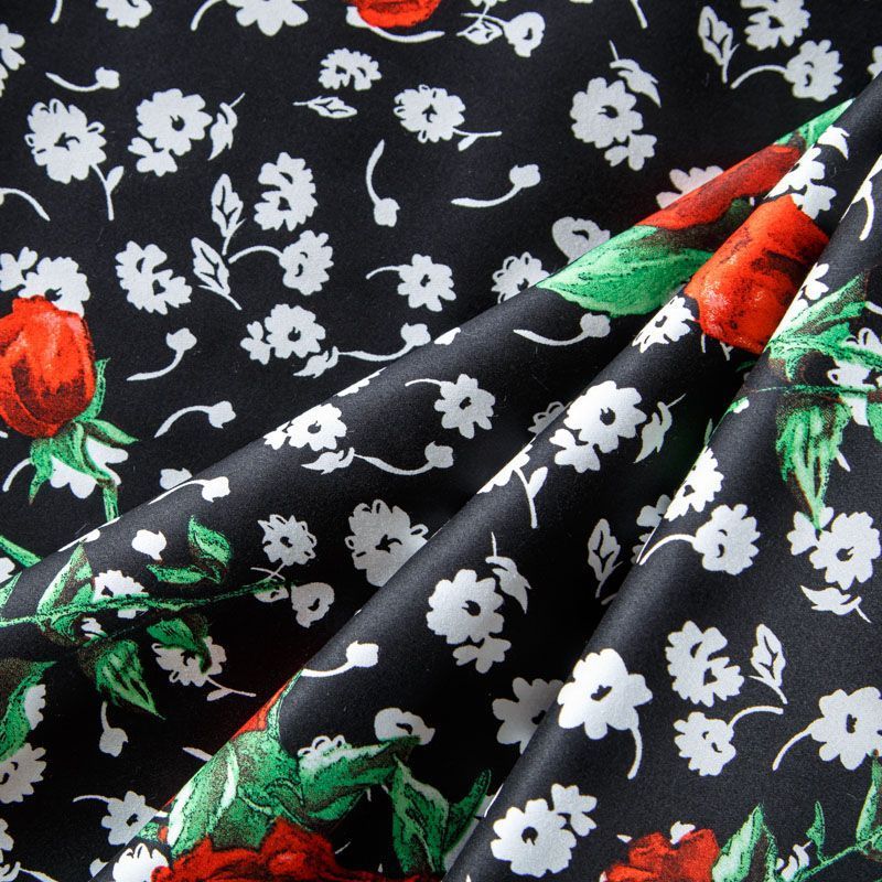 Коттон черного цвета с ярким цветочным принтом. Поверхность гладкая, матовая, ткань средней плотности, не толстая, хорошо держит форму, тянется за счет эластана в составе. Подойдет для пошива костюма, жакета, юбки, платья, брюк или шорт.