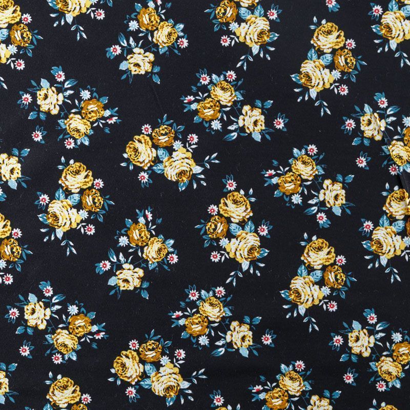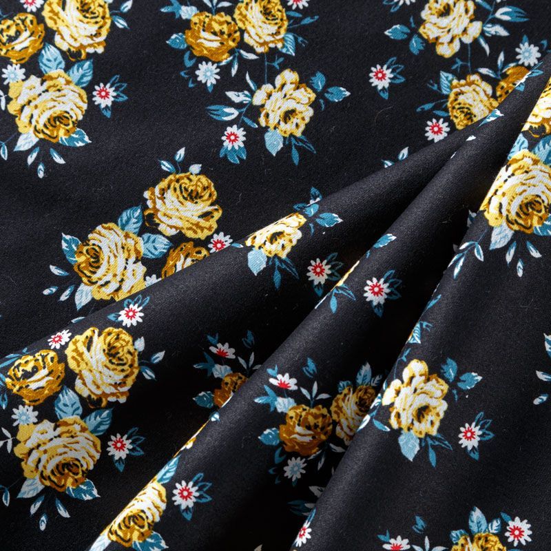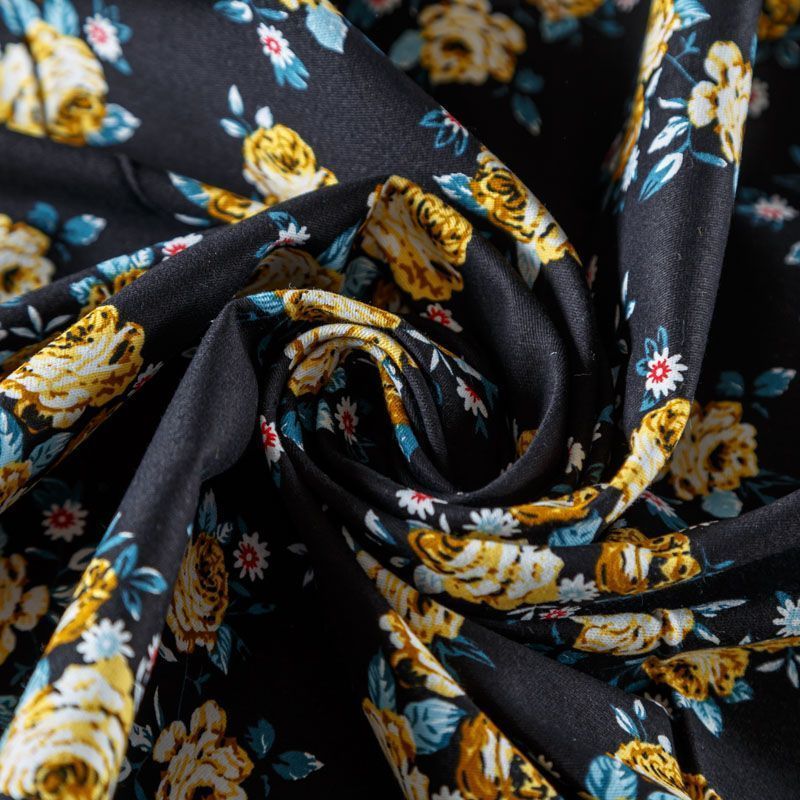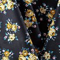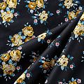 Коттон плательно-костюмной плотности черного оттенка с цветочным принтом. Поверхность гладкая, матовая, хорошо держит форму, тянется за счет эластана в составе. Подойдет для пошива костюма, жакета, юбки, платья, брюк или шорт.