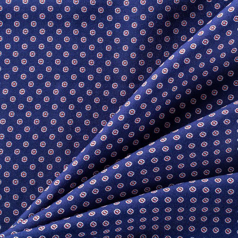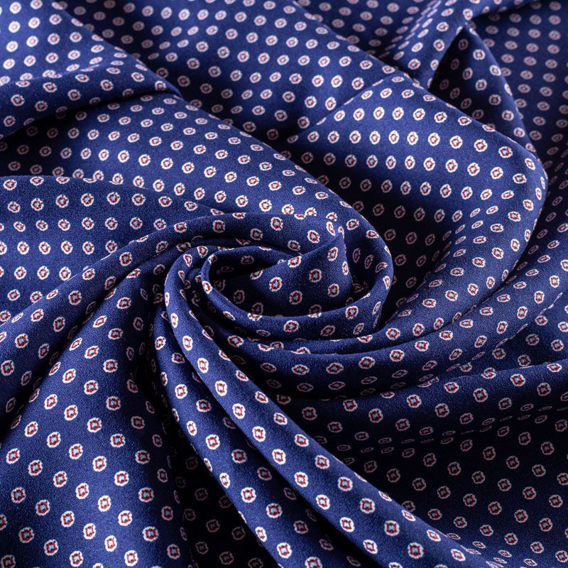 Натуральная вискозная ткань темно-синего оттенка с геометрическим мелким принтом. Легкая, хорошо тянется, драпируется струящимися складками, приятная и комфортная в носке. Материал слегка мнется имеет креповую фактуру. Идеально подходит для пошива  платьев, юбок, блуз, комбинезонов.
