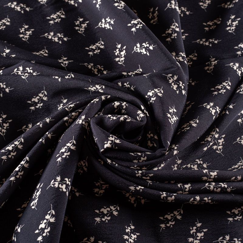 Итальянская натуральная вискозная ткань черного цвета с растительным принтом. Ткань легкая, хорошо тянется, драпируется струящимися складками, приятная и комфортная в носке. Материал слегка мнется, имеет креповую фактуру. Идеально подходит для пошива  платьев, юбок, блуз, комбинезонов, костюмов, туник, кардиганов.