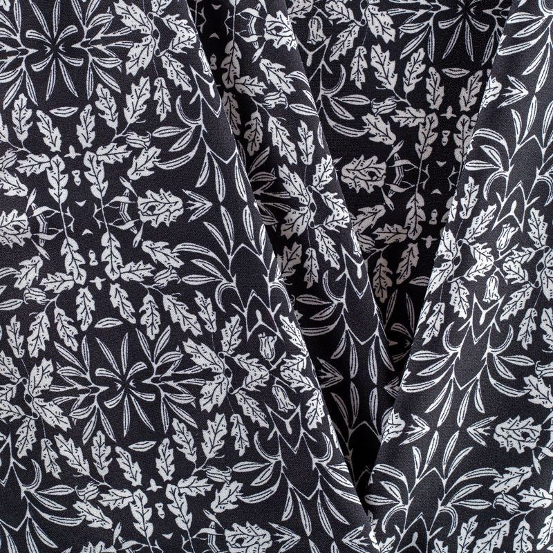 Плательный креп с мелким растительным принтом. Ткань средней плотности, не толстая, пластичная, поверхность полотна матовая, с характерной мелкозернистой фактурой, прочная, практически не мнется, хорошо драпируется. Превосходно подойдет для пошива стильного костюма, юбки, платья, комбинезона, топа, брюк.