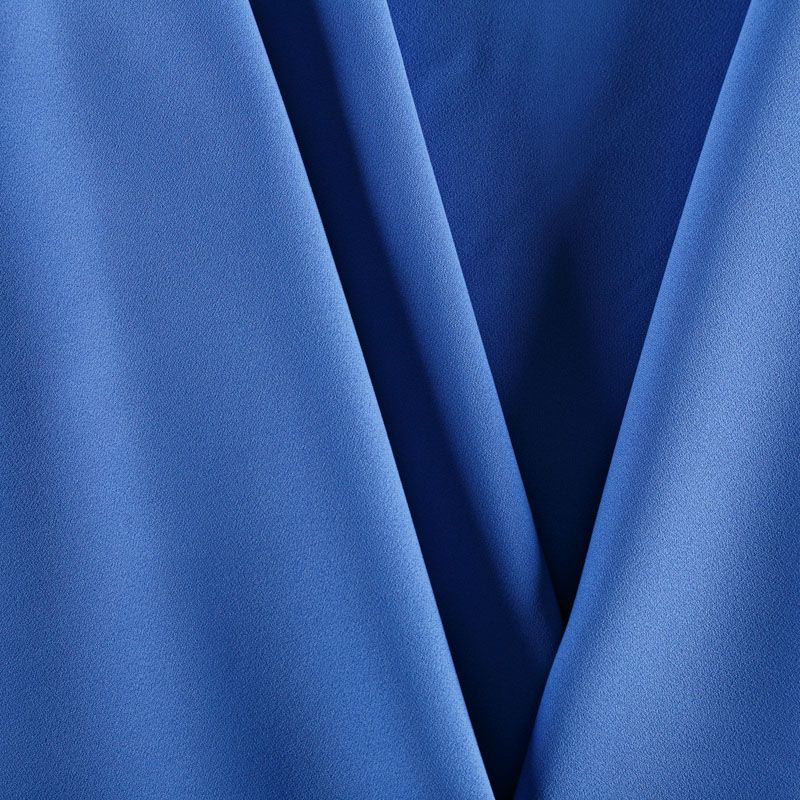Итальянский вискозный креп костюмно-плательной плотности в красивом синем оттенке, поверхность матовая, слегка зернистая. Ткань мягкая, пластичная, образует мягкие фалды, не просвечивает, тянется за счет эластана в составе. Подойдет для пошива весенне-осеннего костюма, платья, комбинезона, юбки, брюк