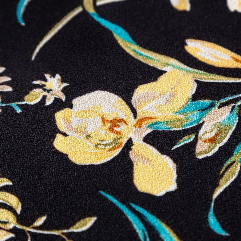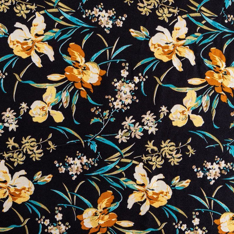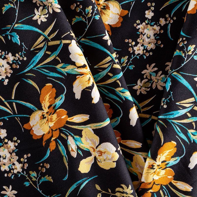 Итальянский вискозный креп плательной плотности глубокого черного цвета с красивым цветочным принтом. Поверхность матовая и фактурная, ткань малосминаемая, тянется за счет эластана в составе, красиво драпируется, струится и дает объемную складку, не просвечивает.Идеально подойдет для шикарного платья, блузы, юбки, комбинезона, брюк свободного кроя.