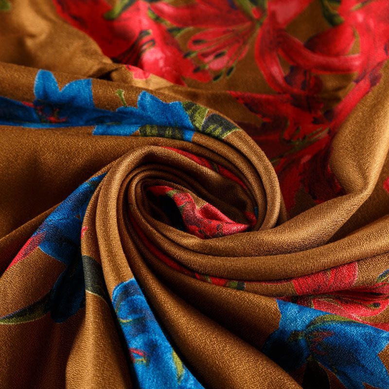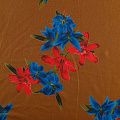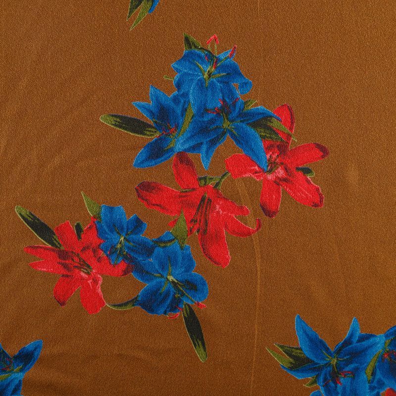 Плательно-блузочный вискозный креп теплого коричневого оттенка с крупным цветочным принтом. Ткань средней плотности, имеет зернистую фактуру и матовую поверхность, не просвечивает, пластичная, хорошо драпируется мягкими складками, струится. Подходит для пошива платья и сарафана, юбки, блузки, туники, топа, комбинезона.