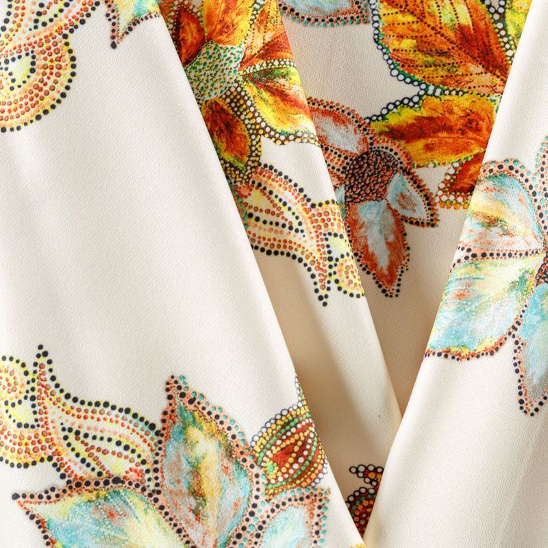 Плательный креп средней плотности, ткань не толстая, пластичная, поверхность полотна матовая, с характерной мелкозернистой фактурой, прочная, практически не мнется, хорошо драпируется, тянется за счет эластана в составе. Превосходно подойдет для пошива свободного костюма, юбки, платья, туники, лонгслива, комбинезона, топа, брюк.