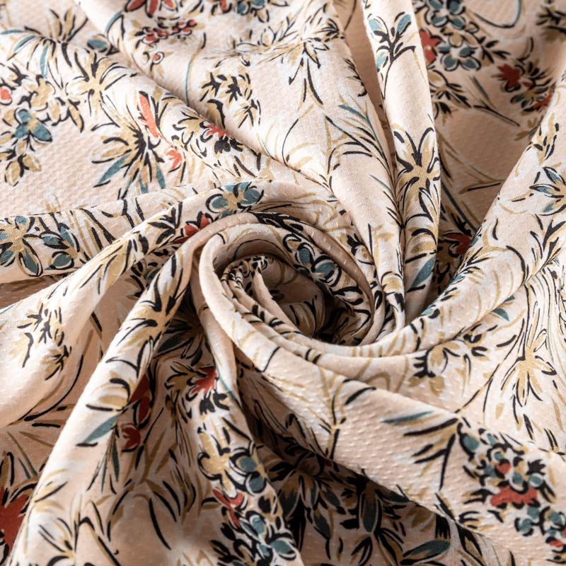 Красивое сочетание оттенков, на сливочном фоне растительный принт в бирюзово-терракотовых тонах. Легкая, пластичная, шелковистая ткань с фактурным мелким узором. Не просвечивается. Мягкая, отлично драпируется и струится. Подойдет для пошива платья и сарафана, юбки, блузки, туники, топа, комбинезона с брюками или шортами, платье-халата.