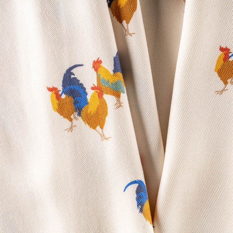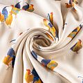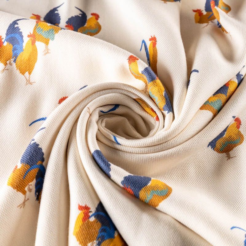 Плотный креп из вискозы с ярким принтом в виде забавных птиц-петушков на молочном фоне. Ткань хорошо держит форму, почти не мнется, имеет заметную фактуру пике и очень прочная - подходит для пошива эффектных бомберов, юбок, платьев в спортивном стиле или легких пальто.
