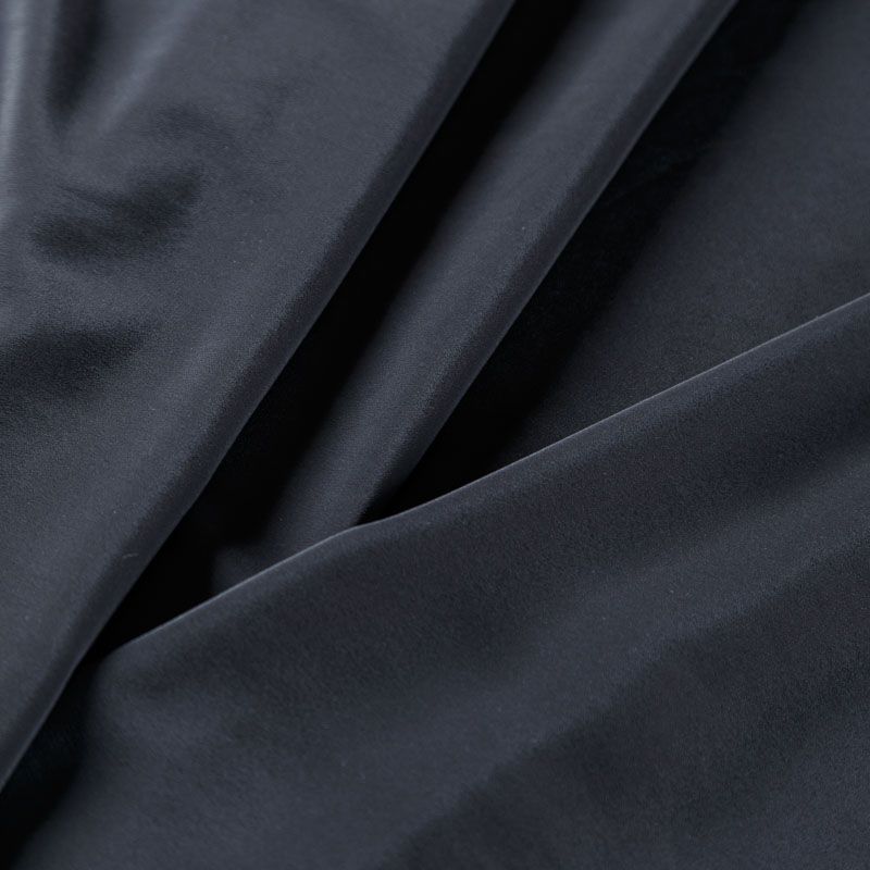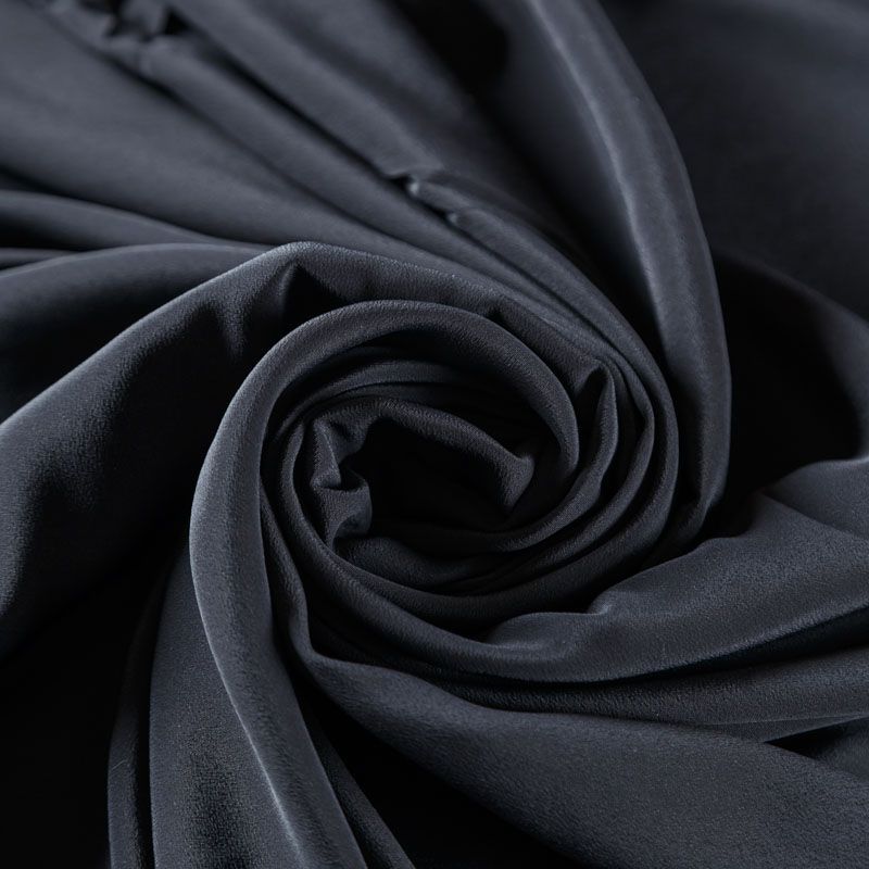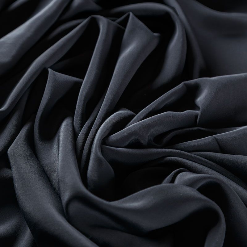 Шелковый крепдешин в черном оттенке, тонкий, легкий, фактурный, приятный на ощупь, тянется за счет эластана в составе. Ткань слегка просвечивает, можно использовать подклад. Прекрасно будет смотреться в платье, юбке, тунике, рубашке или блузке.