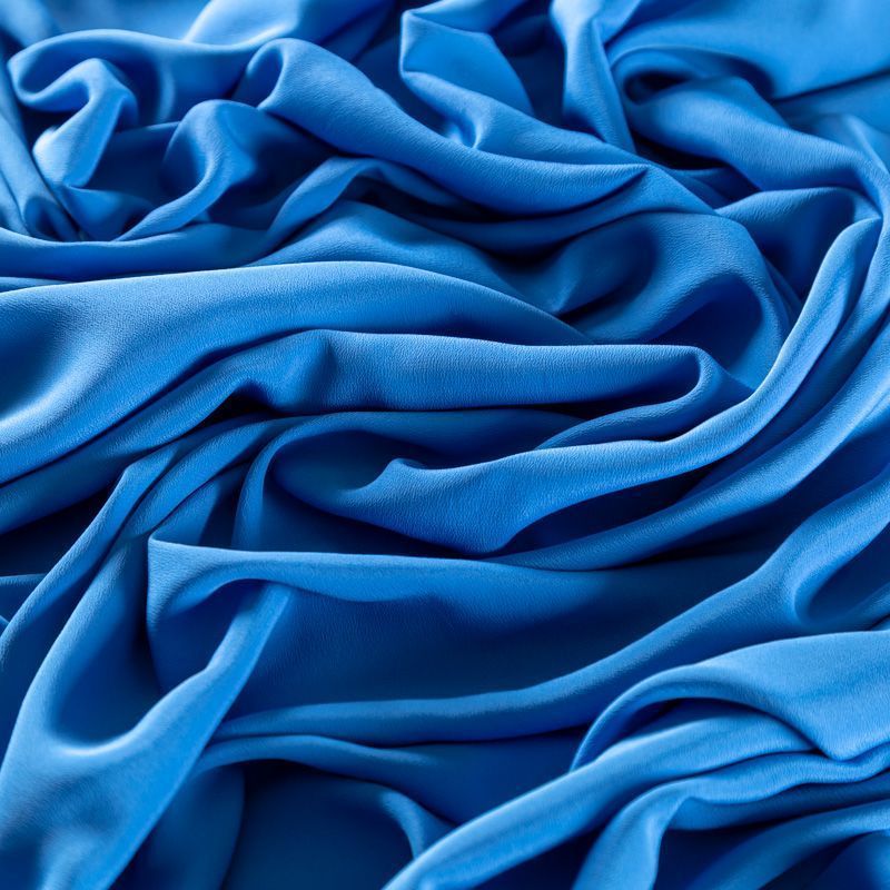 Итальянский натуральный шелковый крепдешин в голубом оттенке, фактурный, легкий и струящийся, слегка просвечивает, отлично драпируется, тянется за счет эластана в составе. Идеально подойдет для пошива платьев и сарафанов расклешенных моделей, с воланами, летящих юбок, топов, блузки, юбки, широких брюк, костюма в пижамном стиле.
