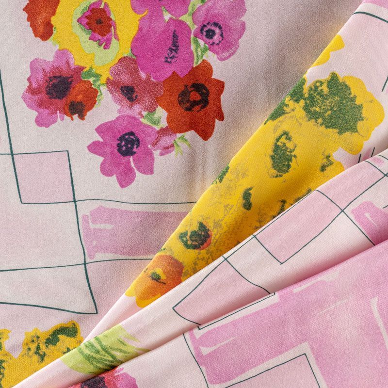 Натуральный шелковый крепдешин с матовой поверхностью, легкий, струящийся, хорошо драпируется. Ткань немного просвечивает, тянется за счет эластана в составе. Универсальный цветочный принт с сочетании в геометрическим рисунком будет уместен для пошива летнего сарафана, платья, блузки, костюма в пижамном стиле, широких брюк или юбки.