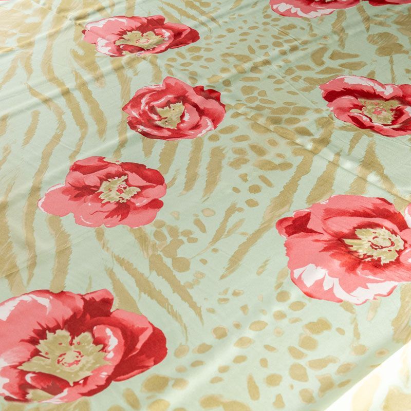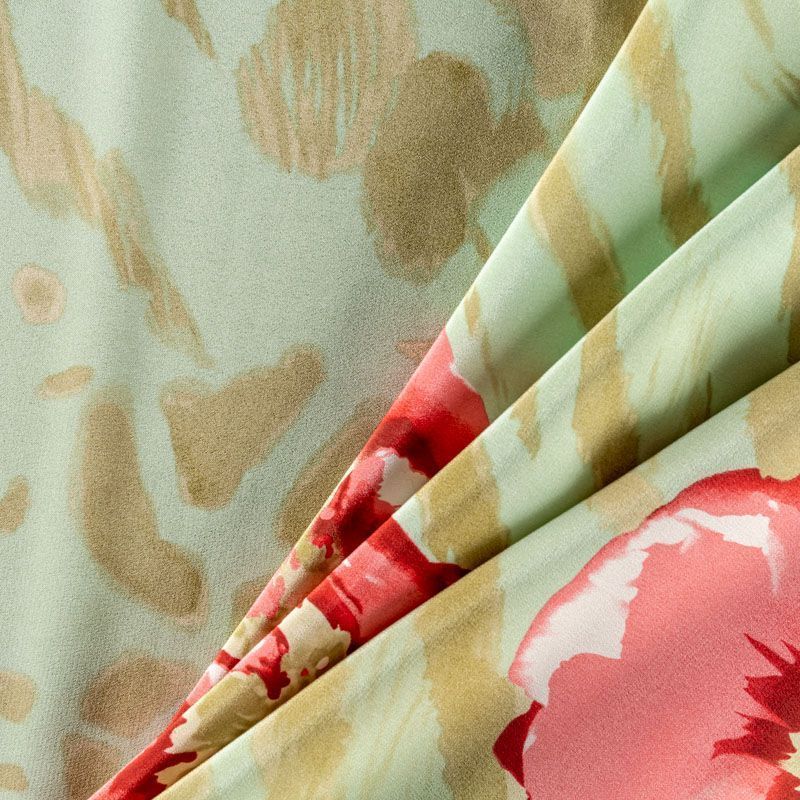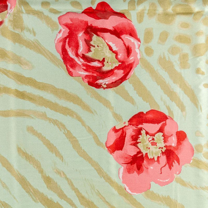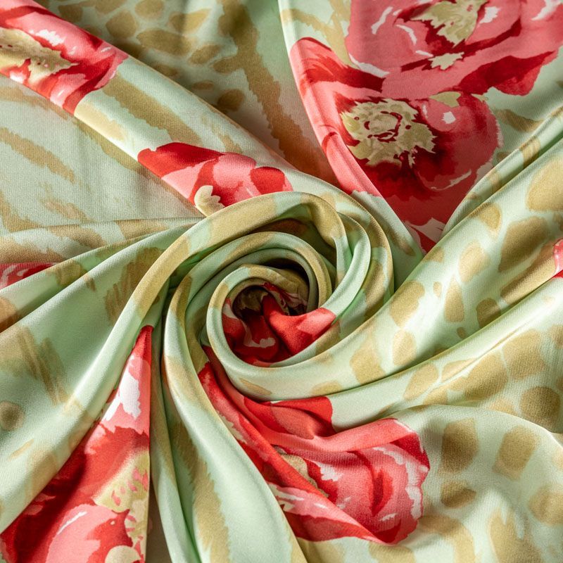Натуральный шелковый крепдешин с матовой поверхностью, легкий, струящийся, хорошо драпируется. Актуальное сочетание яркого цветочного принта с анималистичными мотивами подойдет для пошива летнего сарафана, платья, блузки, костюма в пижамном стиле, широких брюк или юбки.