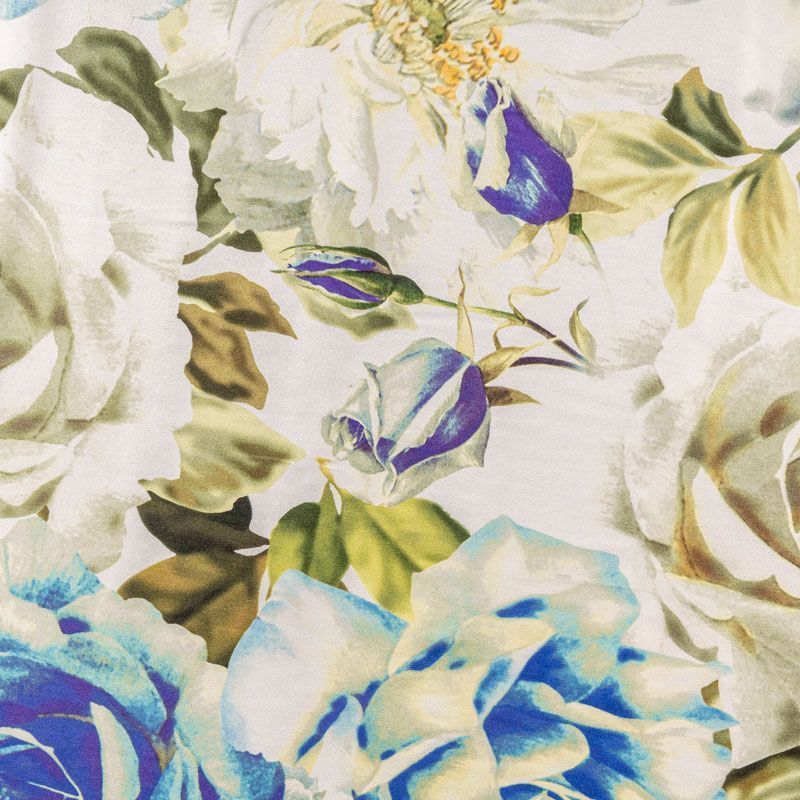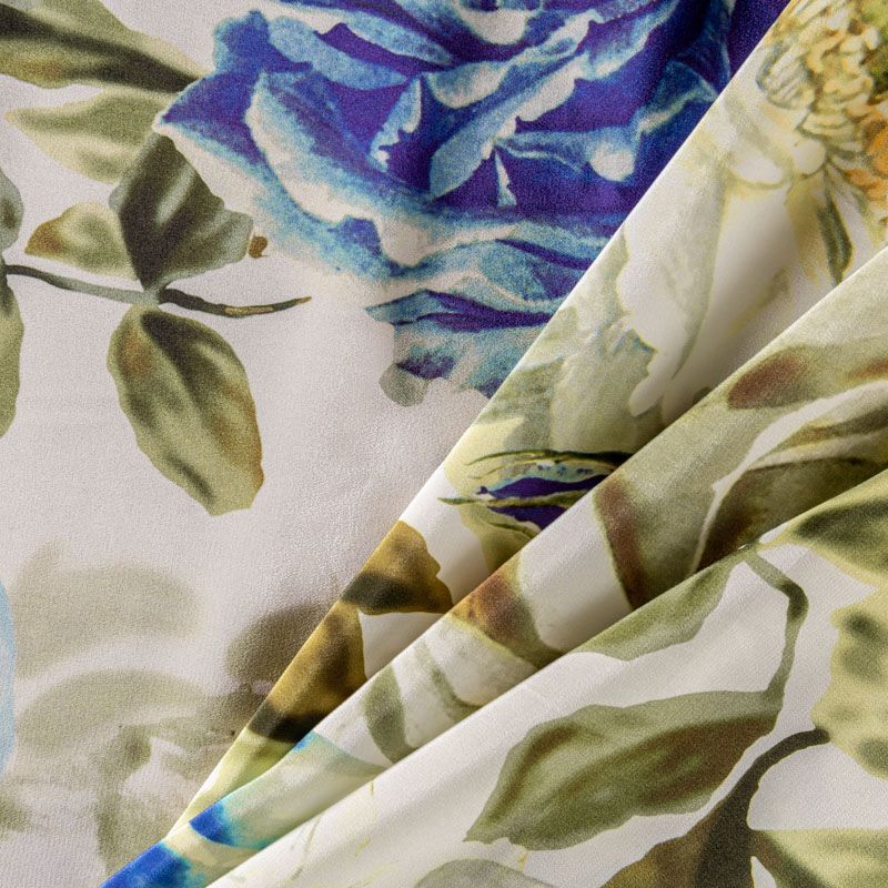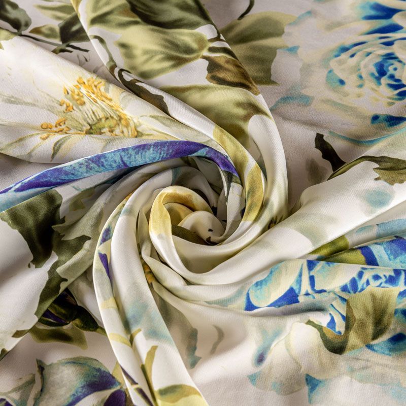 Натуральный шелковый крепдешин с матовой поверхностью, легкий, струящийся, хорошо драпируется.  Цветочный принт в сине-зеленых оттенкам будет уместен для пошива летнего сарафана, платья, блузки, костюма в пижамном стиле, широких брюк или юбки.