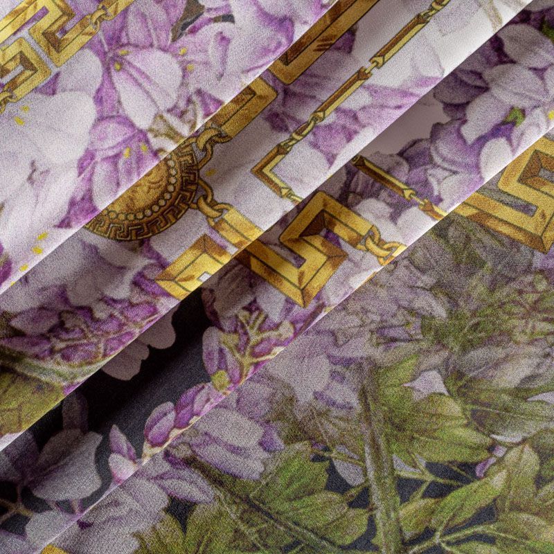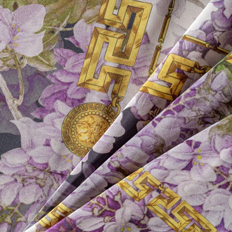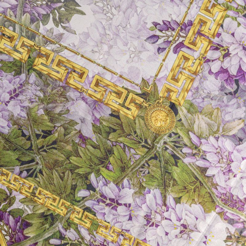Натуральный шелковый платочный купон с матовой поверхностью, легкий, струящийся, хорошо драпируется. Цветочный принт выполнен в приглушенных оттенках и дополнен акцентными золотыми цепями-рамками. В целом купон выглядит очень сдержанно и элегантно, поэтому станет отличным вариантом для