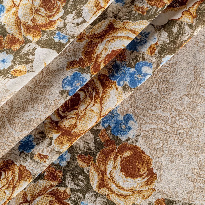 Натуральный шелковый крепдешин с матовой поверхностью, легкий, струящийся, хорошо драпируется. Изысканное сочетание цветочного принта в коричнево-синих оттенках с имитацией нежного тонкого кружева подойдет для пошива летнего сарафана, платья, блузки, костюма в пижамном стиле, широких брюк или юбки.