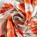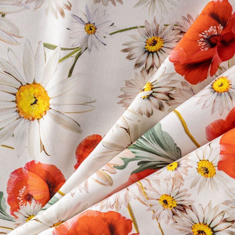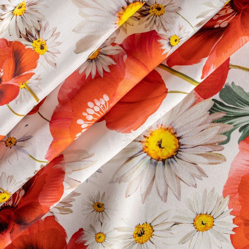 Натуральный шелковый крепдешин с матовой поверхностью, легкий, струящийся, хорошо драпируется, тянется за счет эластана в составе. Яркий летний цветочный принт, актуальный в этом сезоне, будет уместен для пошива летнего сарафана, платья, блузки, костюма в пижамном стиле, широких брюк или юбки.
