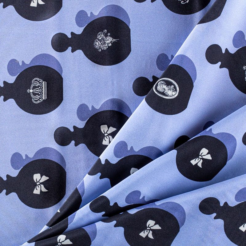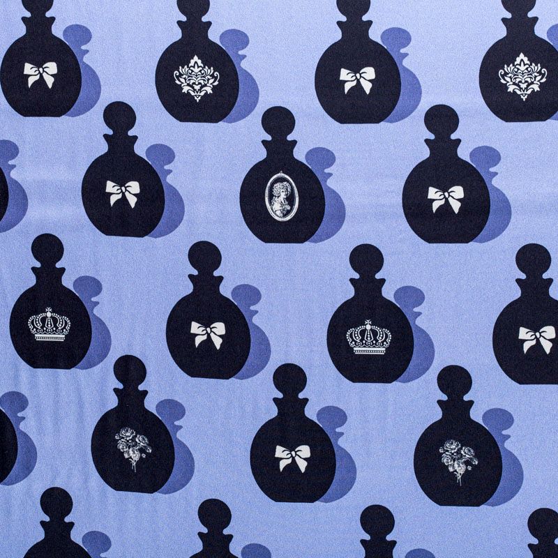 Итальянский крепдешин с матовой лицевой поверхностью со стилизованными флаконами духов на лавандовом фоне, тонкий, слегка прозрачный, отлично драпируется, легкий и струящийся. Идеально подойдет для пошива платьев и сарафанов расклешенных моделей, с воланами, летящих юбок, топов, блузки, костюма в пижамном стиле.