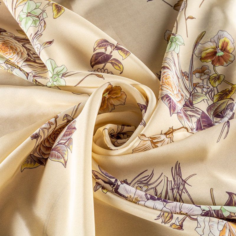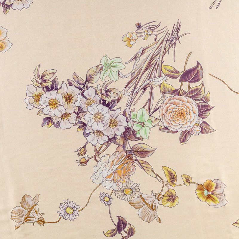 Натуральный шелковый крепдешин с матовой поверхностью, легкий, струящийся, хорошо драпируется. Элегантный цветочный принт выполнен в натуральных оттенках и будет уместен для пошива летнего сарафана, платья, блузки, костюма в пижамном стиле, широких брюк или юбки.