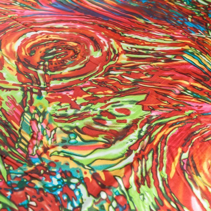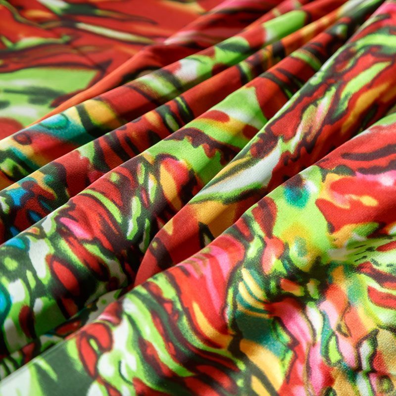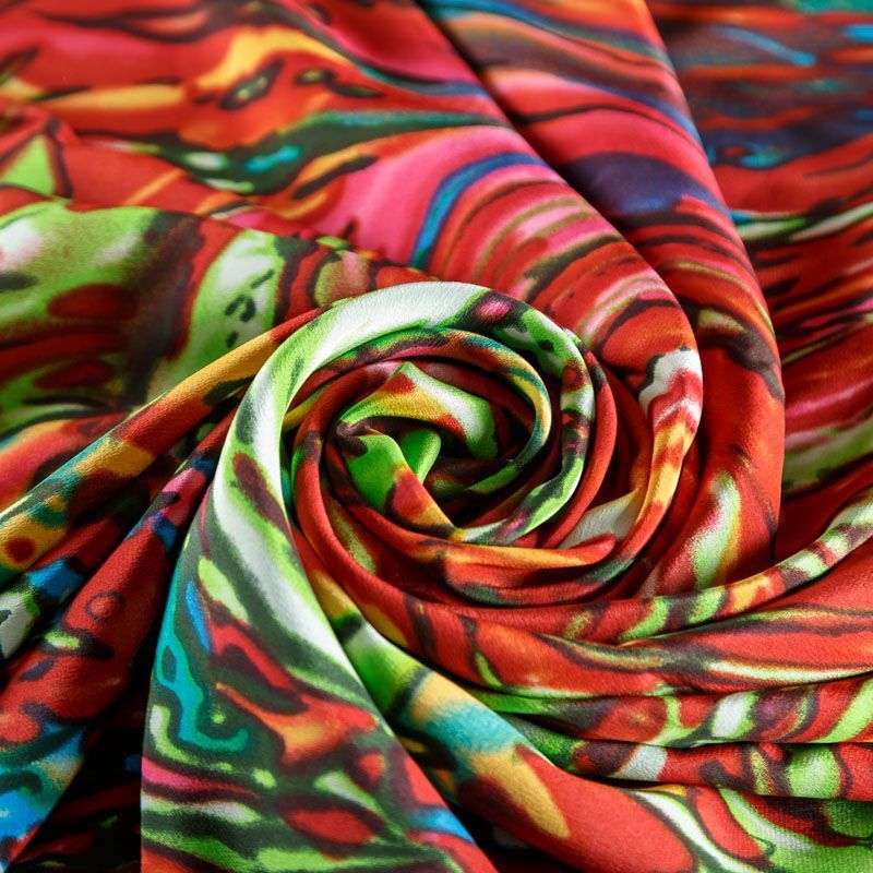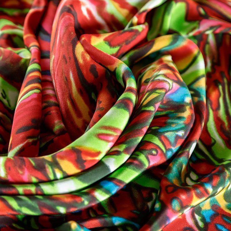 Итальянский крепдешин с матовой лицевой поверхностью с абстрактным ярким принтом на салатовом фоне, тонкий, слегка прозрачный, отлично драпируется, легкий и струящийся. Идеально подойдет для пошива платьев и сарафанов расклешенных моделей, с воланами, летящих юбок, топов, блузки, костюма в пижамном стиле.