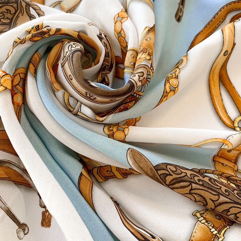 Крепдешин натуральный К32-381 молочно-голубой принтованный