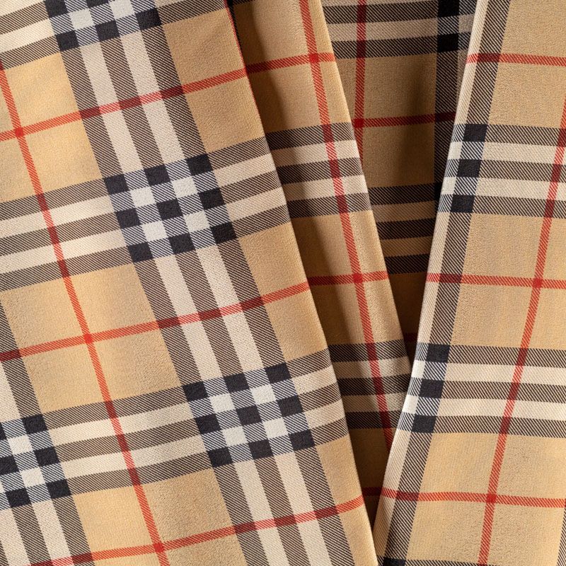 Тонкая шелковая ткань с узнаваемым принтом представляет собой крупную клеточку на золотисто-бежевом фоне. Этот крепдешин почти не просвечивает, хорошо драпируется, имеет матовую креповую поверхность. Идеально подойдет для пошива блузы, платья и юбки.