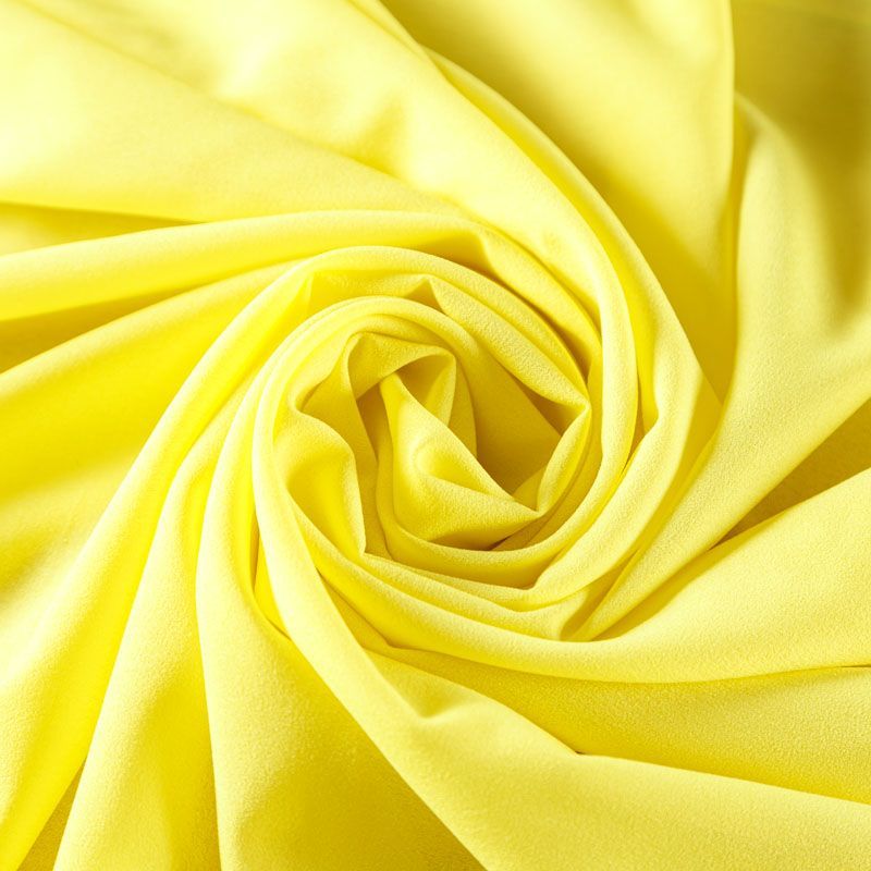 Крепдешин ярко-желтого оттенка с зеленоватым подтоном, тонкий, легкий, фактурный, приятный на ощупь. Очень пластичный, тянется за счет эластана в составе, прекрасно драпируется и струится. Ткань слегка просвечивает, можно использовать подклад. Идеально будет смотреться в платье, юбке, тунике, рубашке или блузке.