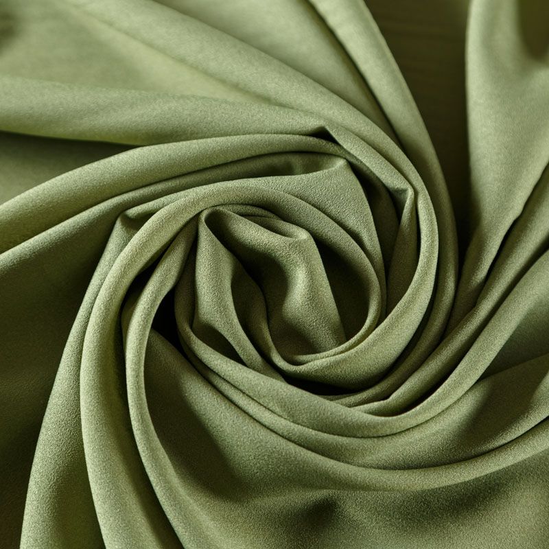 Крепдешин зеленого оттенка, тонкий, легкий, фактурный, приятный на ощупь. Очень пластичный, тянется за счет эластана в составе, прекрасно драпируется и струится. Ткань слегка просвечивает, можно использовать подклад. Идеально будет смотреться в платье, юбке, тунике, рубашке или блузке.