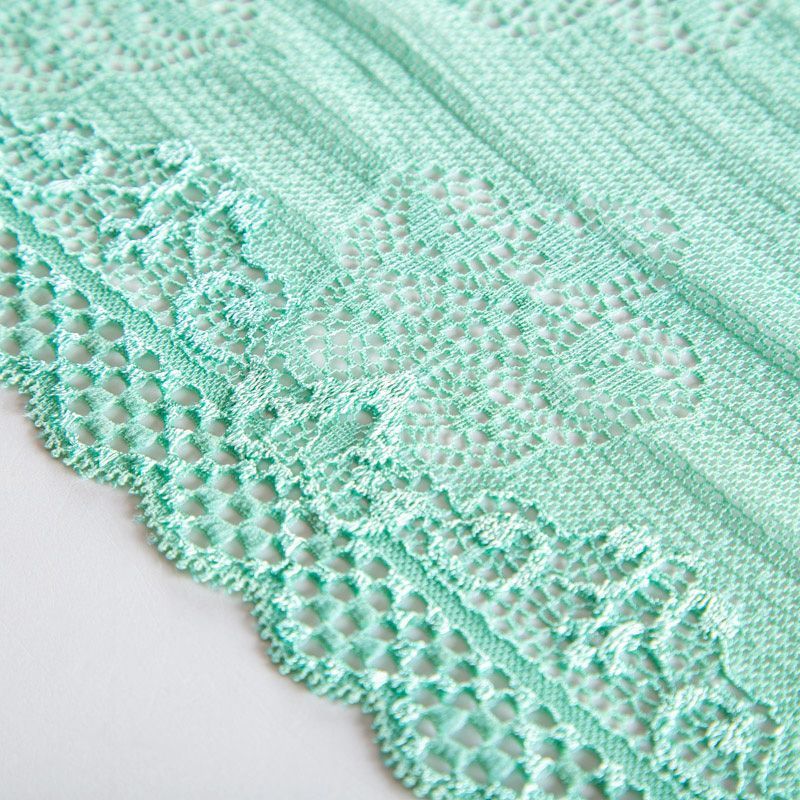 Эластичное кружево сочетает в себе мягкость, прочность и красоту, благодаря своей упругости оно долго не теряет первоначальную форму. Используется для пошива нижнего белья, а так же применяется как отделочный декор в одежде.