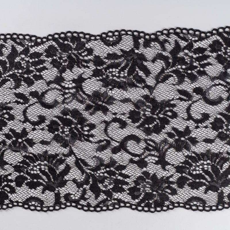 Эластичное кружево сочетает в себе мягкость, прочность и красоту, благодаря своей упругости оно долго не теряет первоначальную форму. Используется для пошива нижнего белья, а так же применяется как отделочный декор в одежде.