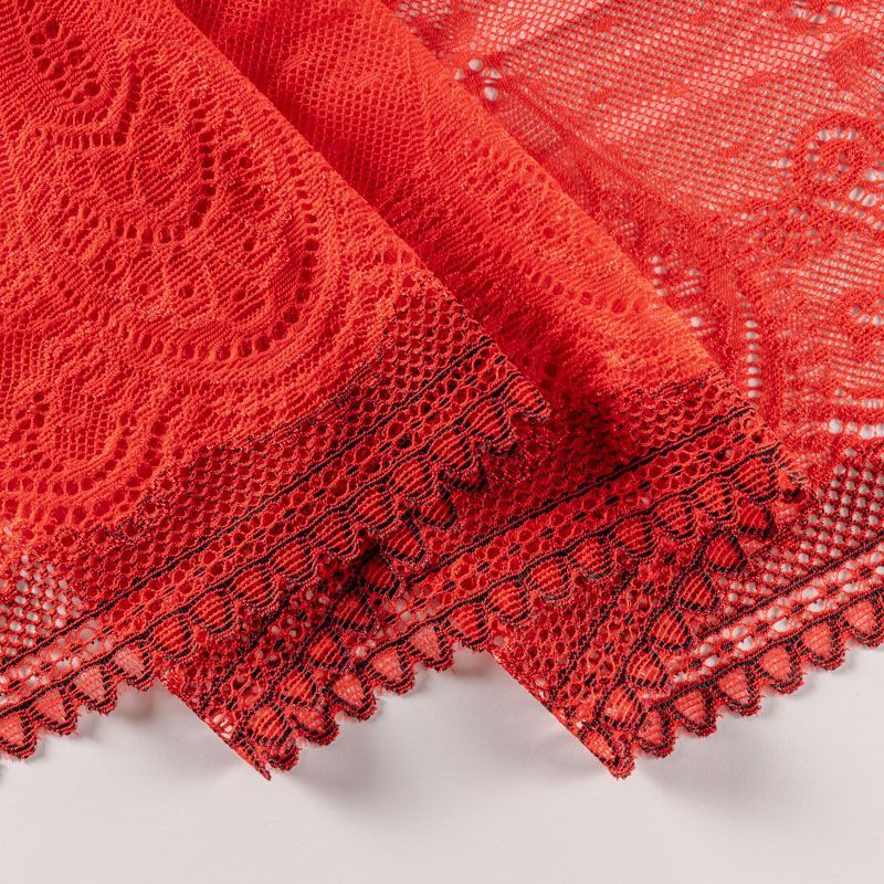 Эластичное кружево сочетает в себе мягкость, прочность и красоту, благодаря своей упругости оно долго не теряет первоначальную форму. Используется для пошива нижнего белья, а так же применяется как отделочный декор в одежде.