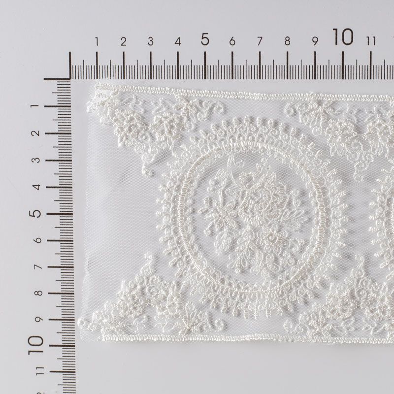 Кружево на сетке представляет собой кружевное полотно, основа которого сетка или фатин. Применяется для декоративной отделки лёгкой женской одежды и домашнего текстиля. Края фигурные, обработаны с двух сторон.
