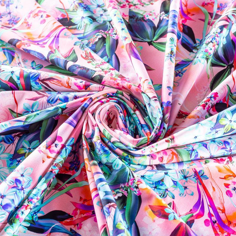 Итальянский бифлекс с цветочным принтом в голубых оттенках на нежном розовом фоне. Поверхность ткани матовая и гладкая. Отлично тянется, одежда из него не сковывает движения. Хорошо впитывает влагу и быстро высыхает, не вызывет аллергии и раздражения. Используется для пошива эстрадных, спортивных костюмов, купальников, боди.