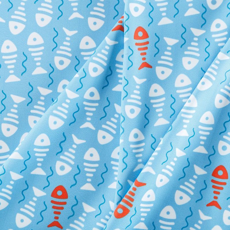 Итальяская качественная, красивая и приятная на ощупь лайкра голубого оттенка со стилизованным оригинальным принтом и матовой поверхностю. Идеально облегает фигуру, тянется по двум направлениям, хорошо драпируется, отлично держит форму, устойчива к пилингу, долговечна и гигроскопична. Используется для пошива одежды для танцев, гимнастики, фигурного катания, для велоспорта, легкой атлетики и аэробики, фитнеса и других видов спорта, для купальников, женского белья, театральных, цирковых и эстрадных костюмов.