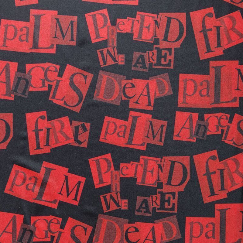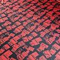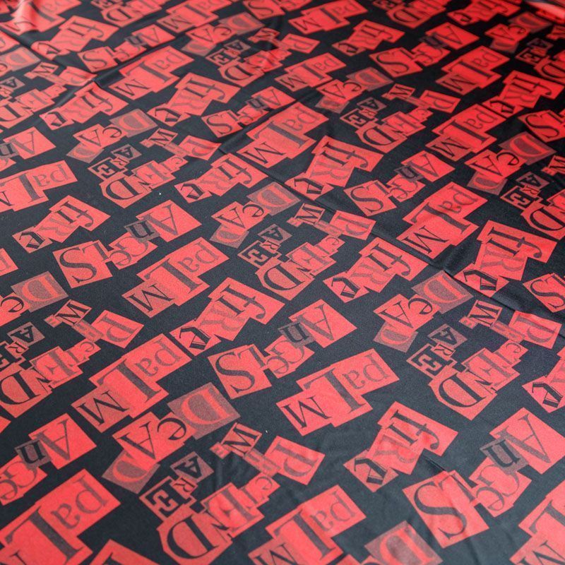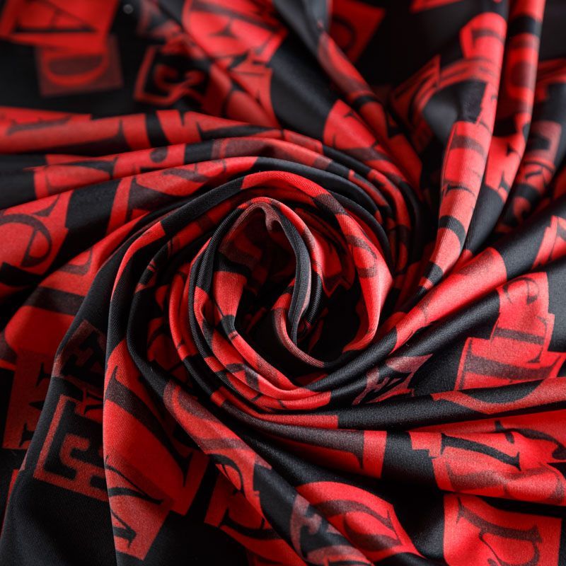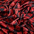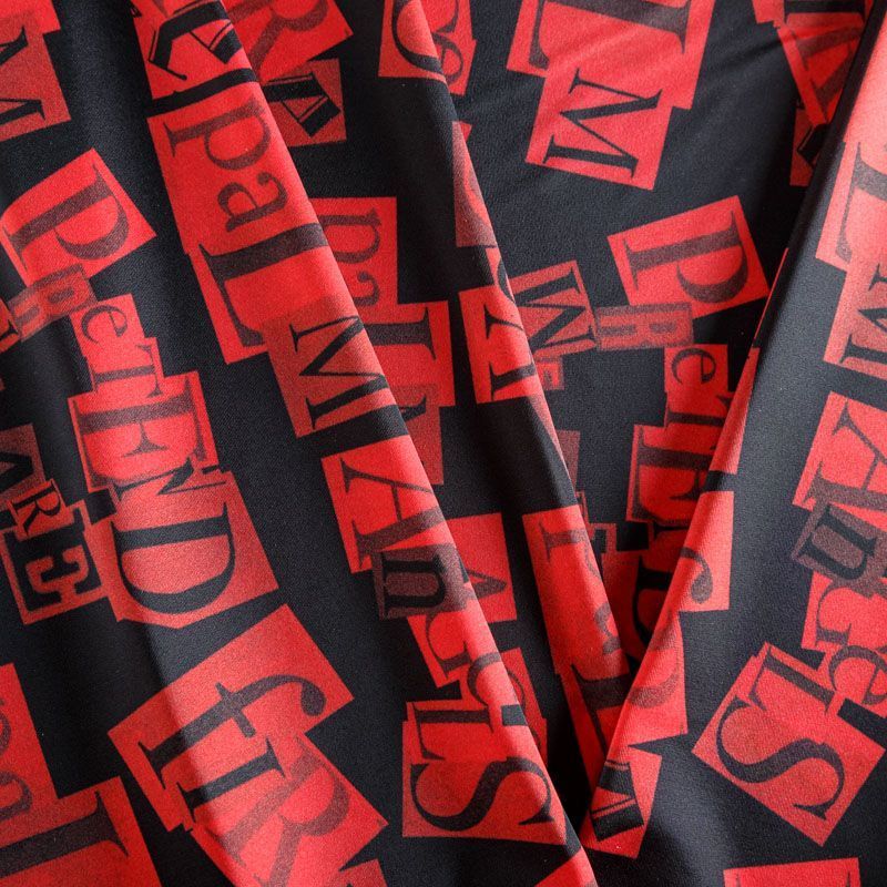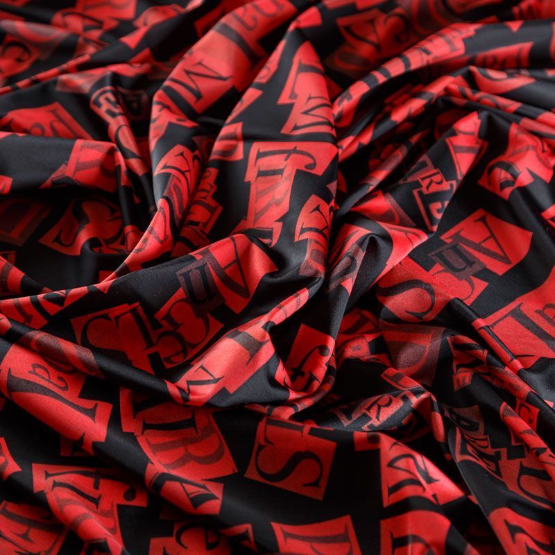 Итальяская качественная, красивая и приятная на ощупь лайкра черного цвета с газетным шрифтом в красном оттенке. Поверхность ткани матовая и гладкая. Идеально облегает фигуру, тянется по двум направлениям, хорошо драпируется, отлично держит форму, устойчива к пилингу, долговечна и гигроскопична. Используется для пошива одежды для танцев, гимнастики, фигурного катания, для велоспорта, легкой атлетики и аэробики, фитнеса и других видов спорта, для купальников, женского белья, театральных, цирковых и эстрадных костюмов.