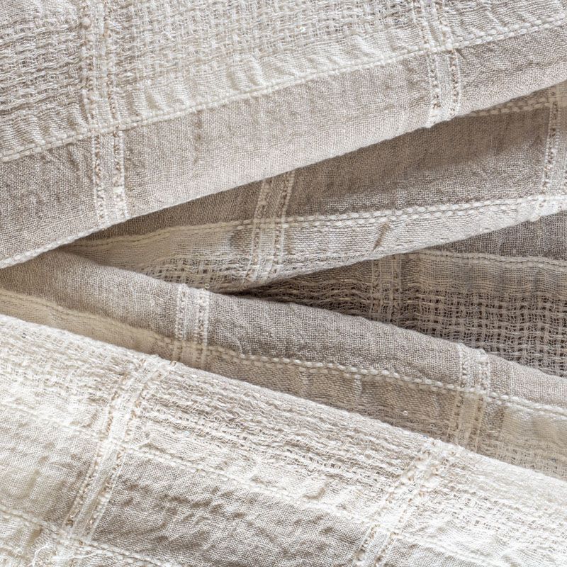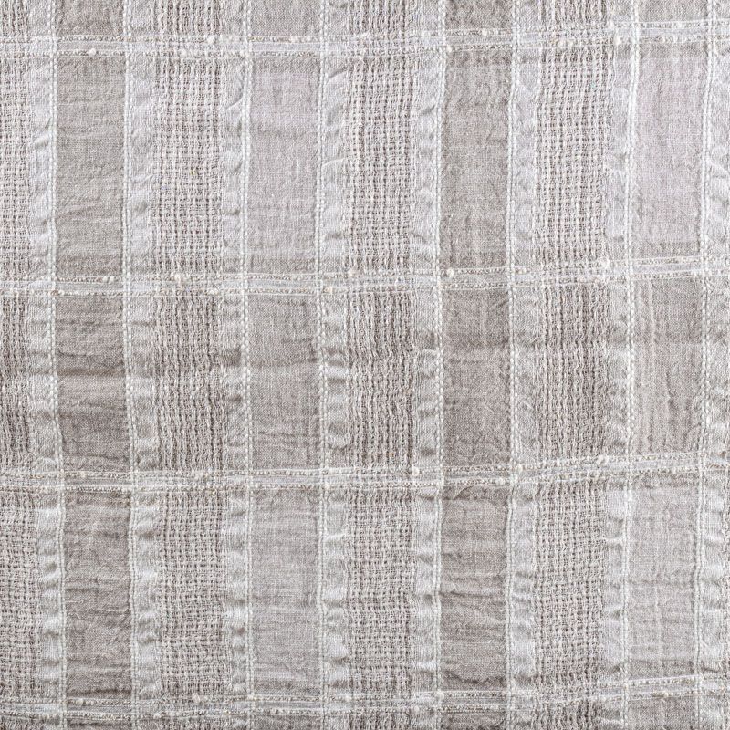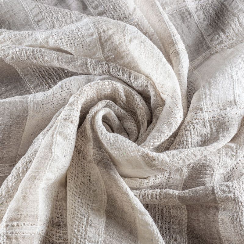 Итальянский лен с добавлением вискозы средней плотности со сложной "клетчатой" геометрией в светлых оттенках декорирован мелкими пайетками. Различная толщина нитей создает эффектную фактуру. Ткань пластичная, гибкая за счет плетения,  матовая, мягкая, приятная на ощупь, не рыхлая, комфортная в изделии. Отлично подойдет для пошива летних костюмов, рубашек, туник, платьев, сарафанов, юбок, жакетов, брюк или шорт, легкого пальто.