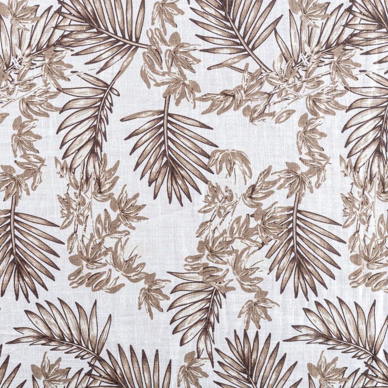 Льняная плательная ткань с добавлением вискозы белого цвета с монохромным растительным принтом. Материал прочный, с выразительной матовой рельефной поверхностью, полотняным плетением, хорошо держит форму, мягкий на ощупь, пластичный, отлично драпируется. Прекрасно подойдет для пошива летних платьев, сарафанов, юбок, рубашек, брюк и шорт.