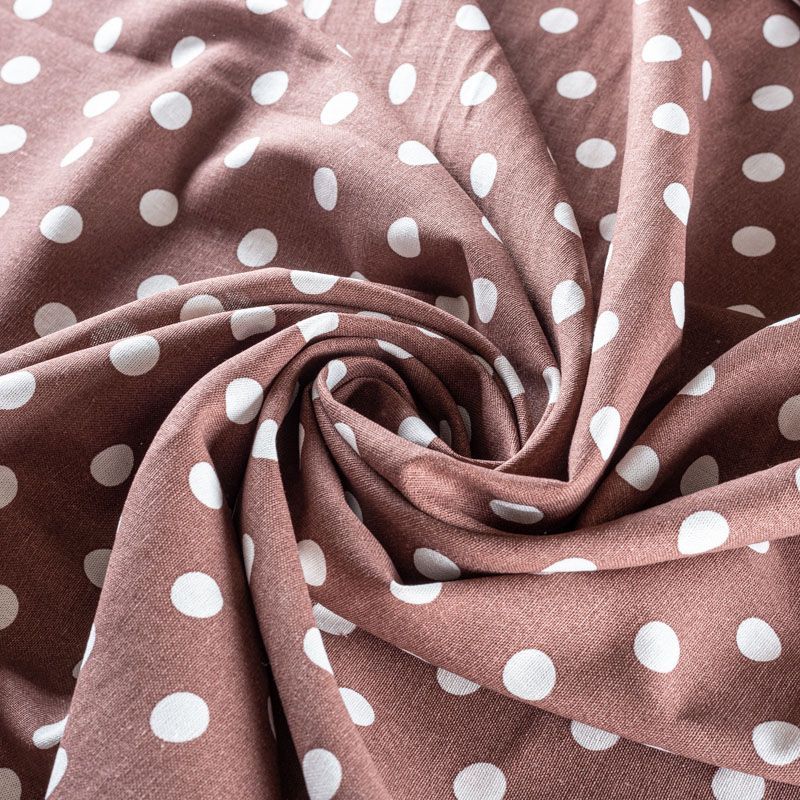 Льняная костюмно-плательная ткань кофейного оттенка в белый горох. Ткань прочная и плотная, с выразительной матовой рельефной поверхностью и полотняным переплетением, отлично держит форму, комфортная в изделии. Стильный вариант для летних пальто, кардиганов, платьев, сарафанов, юбок, жакетов, брюк или шорт.