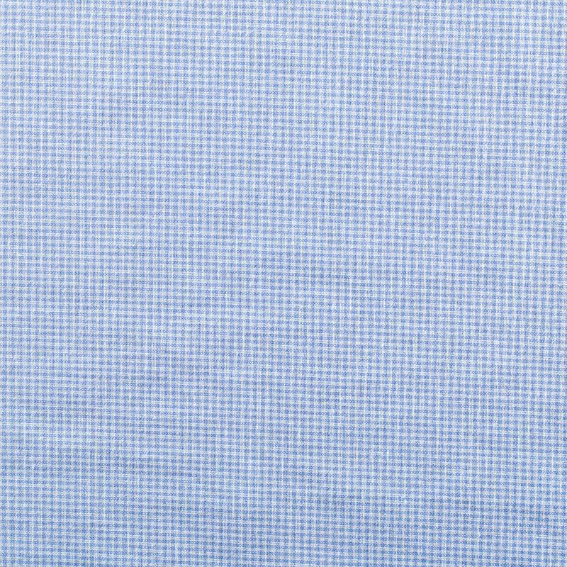 Льняная плательная ткань с добавлением хлопка и полиэстера голубого оттенка в мелкую клеточку. Материал прочный, с выразительной матовой рельефной поверхностью, полотняным плетением, хорошо держит форму, мягкий на ощупь, пластичный, отлично драпируется. Прекрасно подойдет для пошива летних платьев, сарафанов, юбок, рубашек, брюк и шорт.