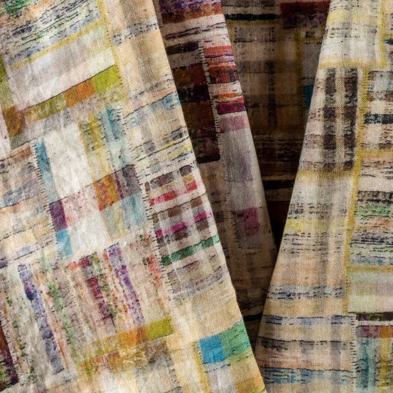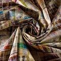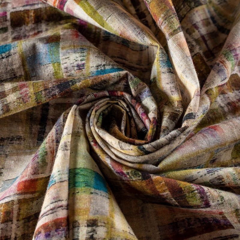 Плательно-рубашечный лен цвета хаки с абстрактным многоцетным принтом. Ткань легкая, средней плотности, поверхность матовая. Приятная на ощупь, хорошо держит форму, немного тянется. Отличный вариант для летних  платьев, сарафанов, рубашек, брюк или шорт.