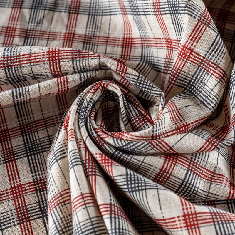 Прочный, выразительная матовая рельефная поверхность, полотняное переплетение, хорошо держит форму, жестковатый на ощупь,сложно драпируется. Прекрасно подойдет для пошива летних жакетов, жилетов, брюк и шорт. Сочетание линий черного, красного и белого цветов образует сложную красивую клетку.